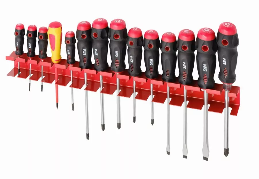 Jeu de 14 tournevis sur rack de rangement.